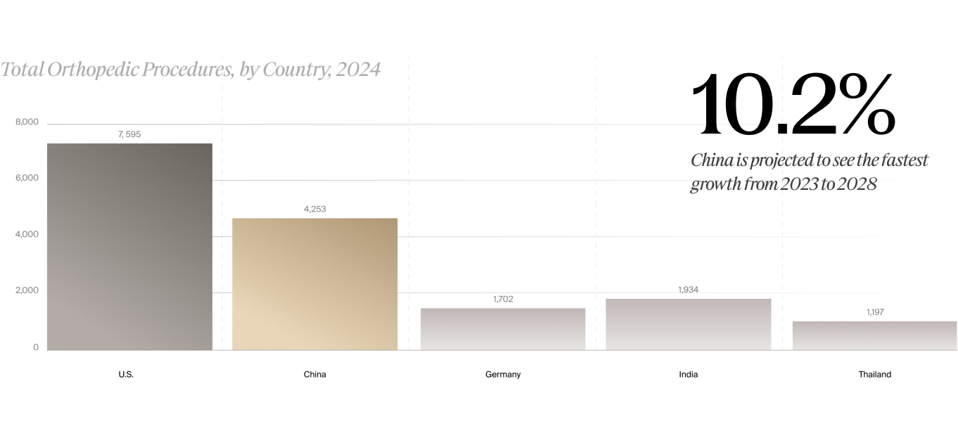 In terms of total orthopedic procedure volumes by country, the U.S. comprises the highest share, with 7.8 million total orthopedic procedures forecast for 2024, followed by China at 4.7 million, then India at 2 million, Germany with 1.7 million, and Thailand at 1.2 million, according to LSI’s global procedure volumes data. However, with a 10.2% annual growth rate, China is projected to surpass the U.S. in orthopedic procedure volumes after 2030, according to LSI (see figure).