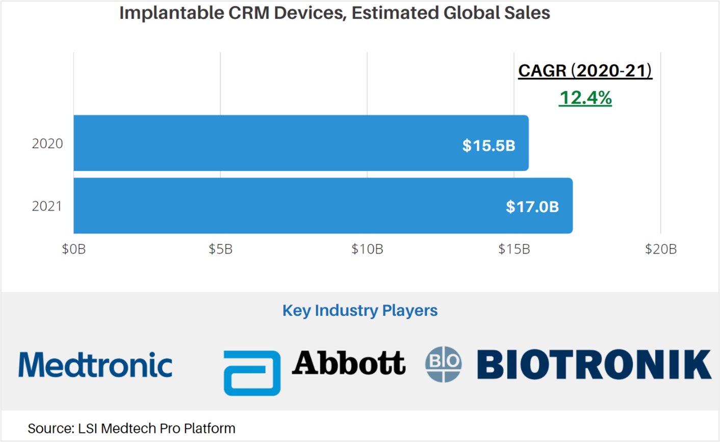According to market data from LSI, global sales attributable to implantable CRM were approximately $15.5B. Due to the impact of the COVID-19 pandemic on the healthcare system in 2020, a surplus of procedures that were rescheduled or cancelled will be